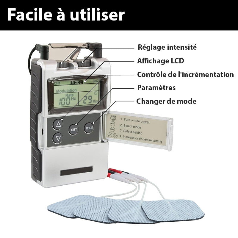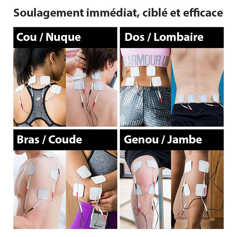 Débarrassez-vous des douleurs en appuyant simplement sur un bouton. Cet électrostimulateur vous offre un soulagement immédiat, ciblé et efficace pour le dos, le cou, les épaules, et bien plus.