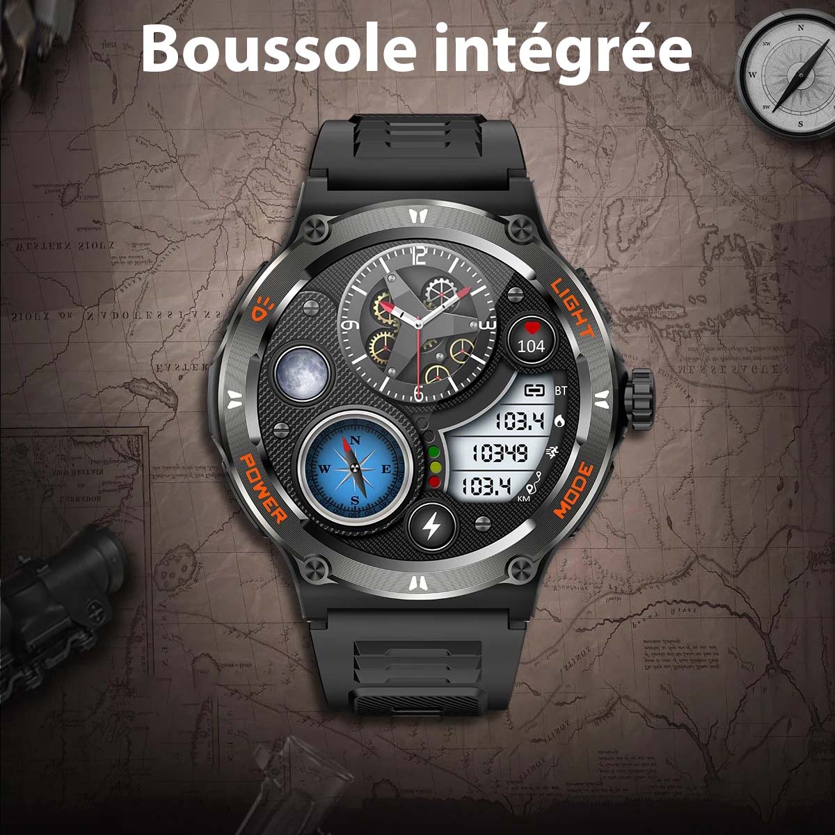 Équipez-vous d'une montre sport connectée qui allie style et fonctionnalité. Affrontez chaque défi avec son écran HD lumineux, sa torche LED et sa boussole intégrée.